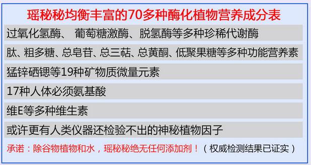 经国家权威机构(青岛科创)检测,瑶秘秘一款产品中不可思议地天然产生(绝非添加),比同类多款产品总和还多且配伍均衡的,70多种天然丰富均衡易吸收的酶化植物营养素:代谢酶、肽、粗多糖、总皂苷、总三萜、总黄酮,猛锌硒锶等19种矿物质、必须氨基酸、多种维生素等。这就是瑶秘秘“举世罕见同时具有将废死细胞代谢出人体,修复、新生细胞等三大细胞代谢功能”,且在疾病康复中起核心作用的物质基础!